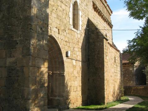 Aunque de estilo gótico en su conjunto esconde bajo su torre románica un pórtico ocluido de gran interés románico. Nave única de planta rectangular de tres tramos, con dos capillas laterales de menor puntal y ábside recto. La entrada se ubica en el segundo paño al sur, es de trazas góticas, abocinada con arcos ojivales que descansan en capiteles decorados de pilastras y jamabas lisas sobre podium alto. Las bóvedas de los tramos de la nave son de crucería estrellada con claves centrales, arcos fajones apuntados sobre pilastras. Frente a esta, en el muro Norte, encontramos la portada románica original del templo, bajo un pórtico de arcos ojivales, hoy cerrado y convertido en capilla. Esta portada es muy abocinada, tiene cinco arquivoltas de medio punto, decoradas con puntas de diamantes o con sencillo baquetón. Sobre este pórtico se desarrolla la torre románica adosada al muro Norte del templo.